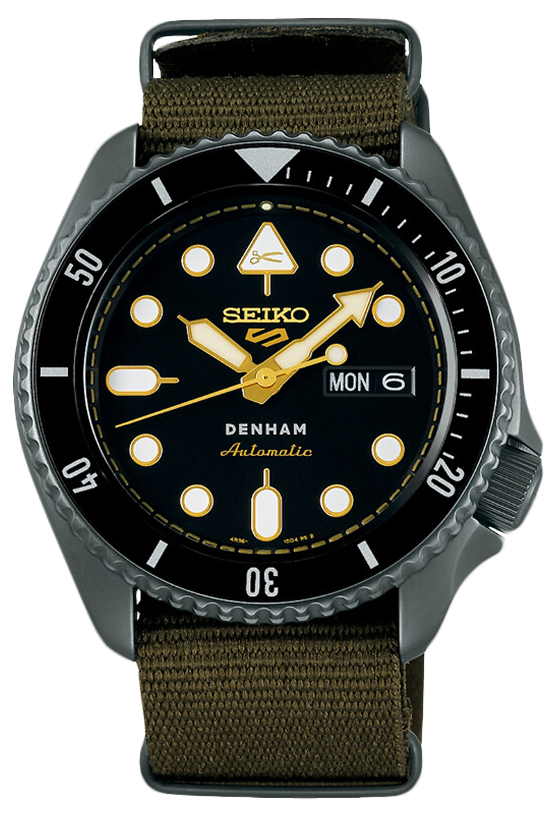 Seiko 5 Sports és a Denham kollab modelljének második kiadása, az SRPL37K1. A koncepció mit sem változott, ha egy egyedi hang a divat világából és a világ egyik legnagyobb óragyártója összefog, abból csak siker lehet, újra. Jason Denham, a cége névadója már 2008 óta készíti saját, egyedi darabjait a “blue jeans”, vagy ahogy mi ismerjük a farmerek világában. Jason Denham jelszava a “Truth is in the details”, vagyis az “Az igazság a részletekben rejlik” A Denham szlogenje akár a Seiko óráira is értelmezhető, hiszen ahogy a minőségi farmereknél, úgy a Seiko óráinál is sokszor a fontos dolgok olyan részletekben bújnak meg, amelyeket a mindennapokban nem is láthatunk, de tudjuk, hogy ott vannak bent a szerkezetekben, kifinomult műszaki megoldásokban. A színösszeállítás kicsit a military stílus felé kacsingat, a sötétszürke bevonatos tokban fekete a számlap és az SKX tokformával járó lünetta betétje is, míg maga az ikonikus formájú tok, a korona és a lünetta is egységesen “gunmetal”, vagyis fegyverszürke színben játszik, ahogy a katonai zöld színű szövet szíj csatja és bújtatói is.A fekete és szürke szigorú egységét arany színű részletek törik meg, a jellegzetes formájú indexek és mutatók arannyal keretezik a Lumibrite fehér színű festést, amely hosszan foszforeszkál a sötétben.Az arany részletek feltűnnek még a fejre fordított 12-es indexben is, ahol a Denham olló logóját találjuk, de arany színű a Seiko 5 Sports logó és az “Automatic” felirat is, amely hat óránál, a Denham logó alatt kapott helyet. A Denham kollab modellek egyik jellegzetes eleme a számlapgyűrű arany színű “varrása”, amely körülöleli a számlapot, és persze a farmerek díszítésére utal. A logó számtalan helyen tűnik még fel, megtaláljuk a koronában és az üveg hátlapon, ahol a farmermárka szlogenje, a “Truth is in the details” is - talán éppen azért, mert ez az üveglap rejti a fontos részleteket odabent. A limitált kiadású modell mindössze 2000 darabban készült és Boutique Exkluzív modell és saját díszdobozt is kapott.